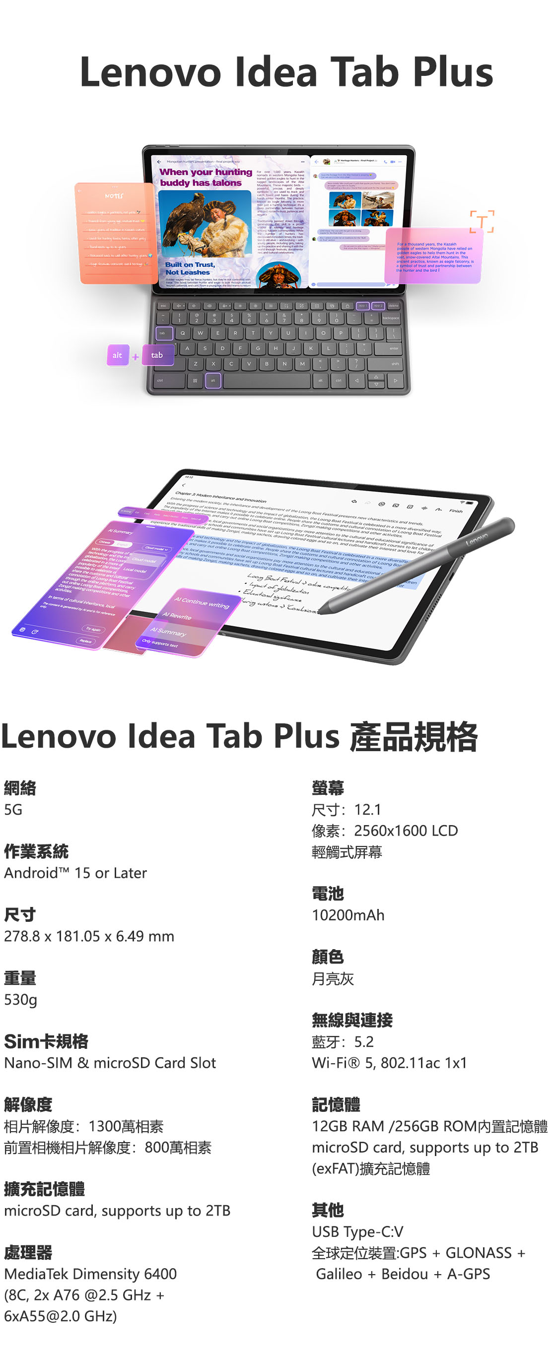 超薄超輕:僅重 530g、厚度僅 6.29mm,輕巧便攜,12.1 吋 2.5K 螢幕:90Hz 更新率、鮮豔的 96% DCI-P3 色域、最高 800 尼特亮度,並提供霧面防眩選項,全天使用更舒適,搭載 MediaTek Dimensity 6400 處理器與 Dolby Atmos 四揚聲器,帶來流暢多工與娛樂體驗。全天電力與快速充電:10,200mAh 大電量可連續串流長達 13 小時,支援 45W 快充,僅需 86 分鐘即可從 0 充至 100%…